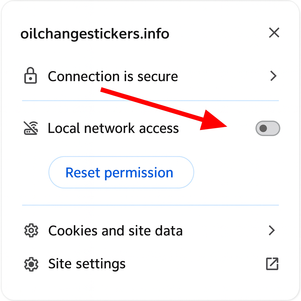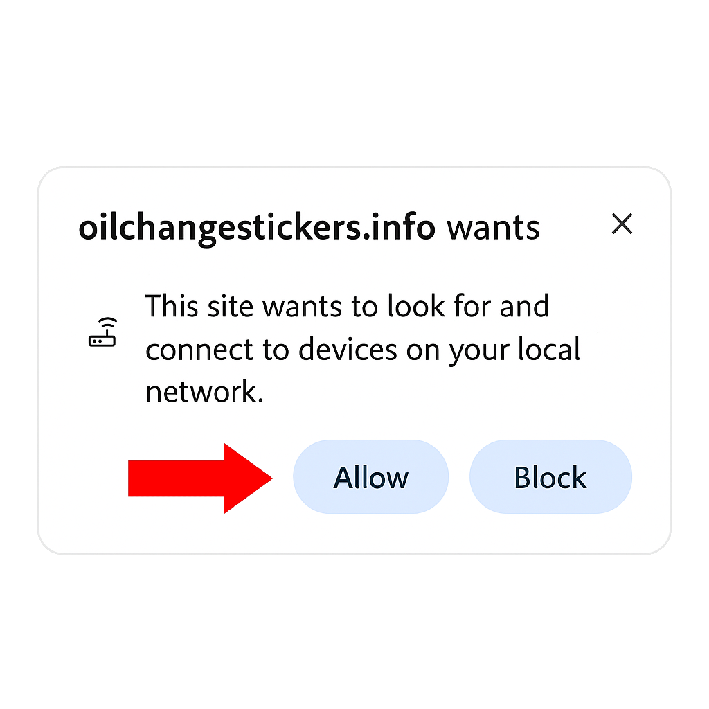 “oilchangestickers.info wants to scan for devices on your local network and connect to them.”